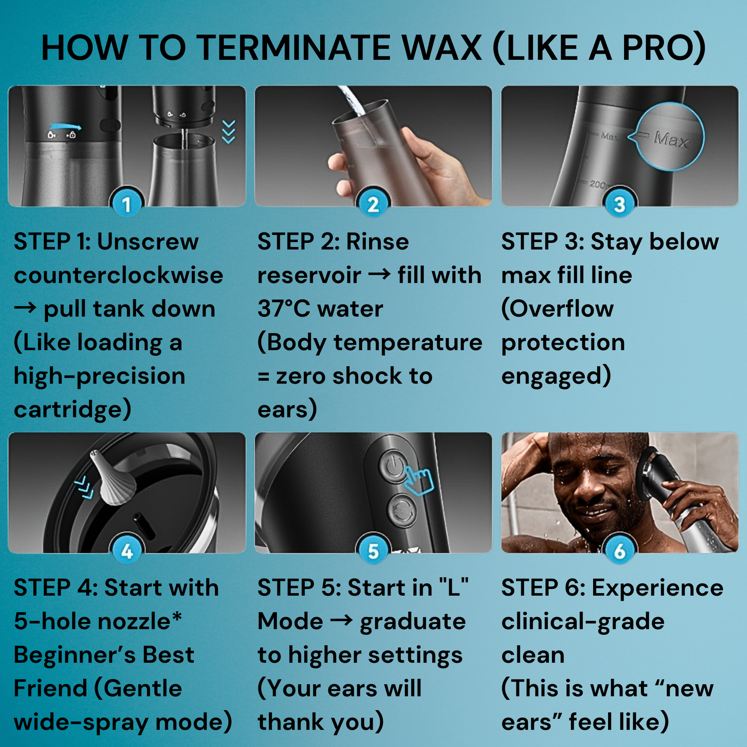 Ditch the Q-tips forever. The EarWax Terminator Pro delivers medical-grade irrigation with 3-stage pressure control, 11 precision tips, and a dual-tank system for mess-free cleaning. IPX7 waterproof, USB fast-charging, and portable enough for travel. Your ears deserve this.