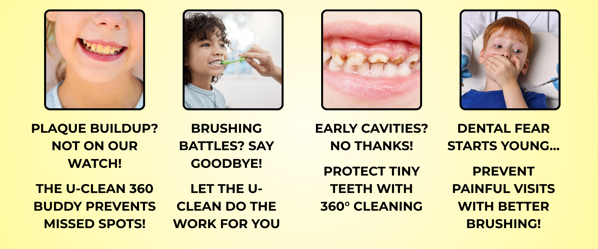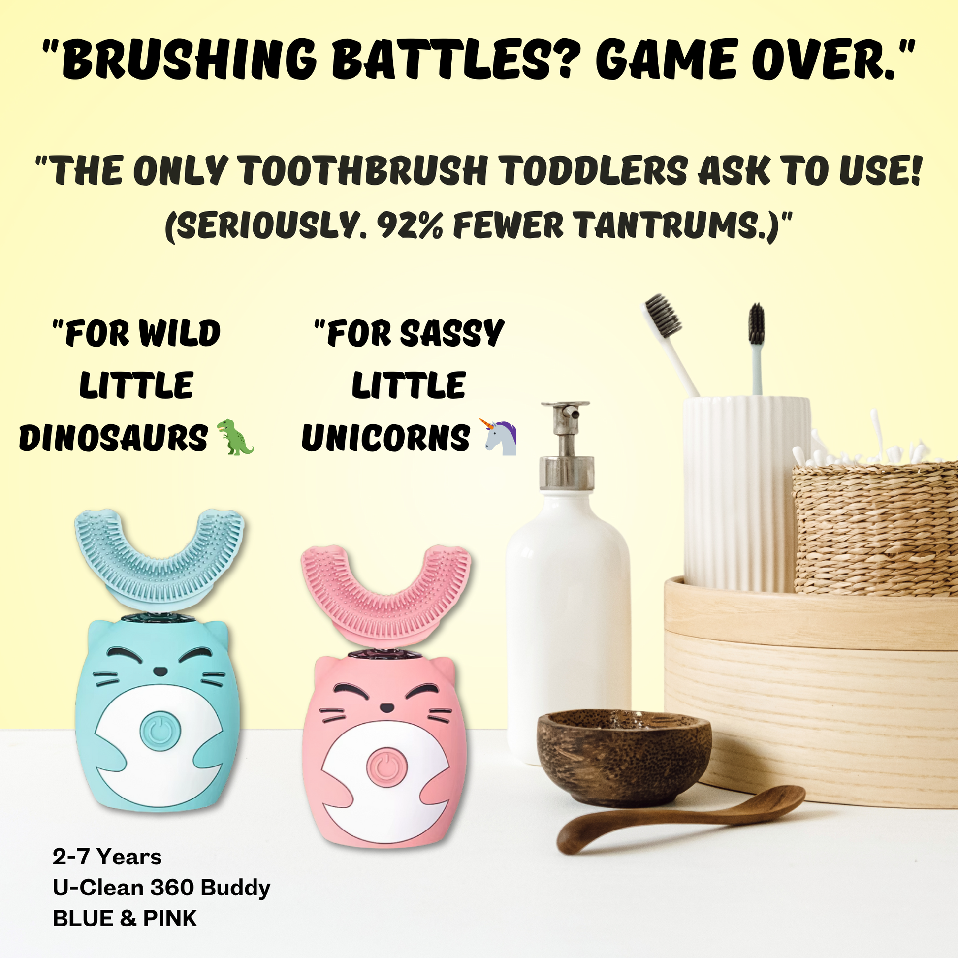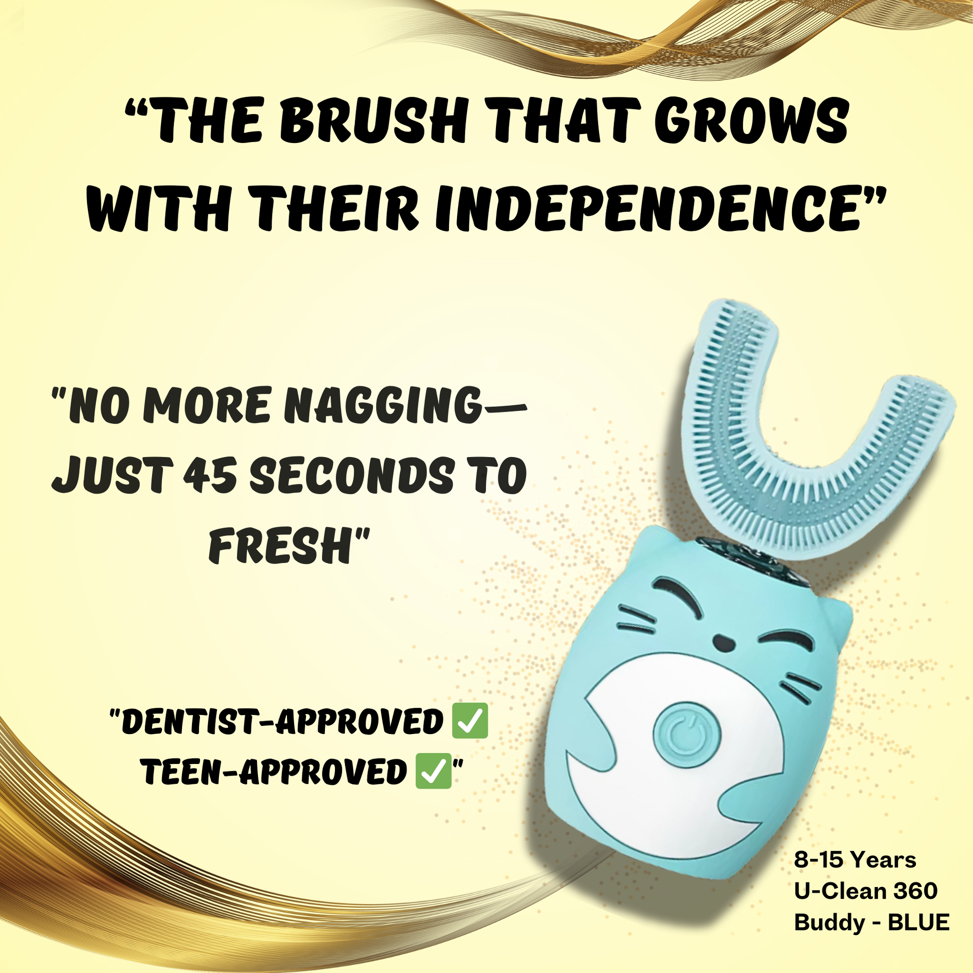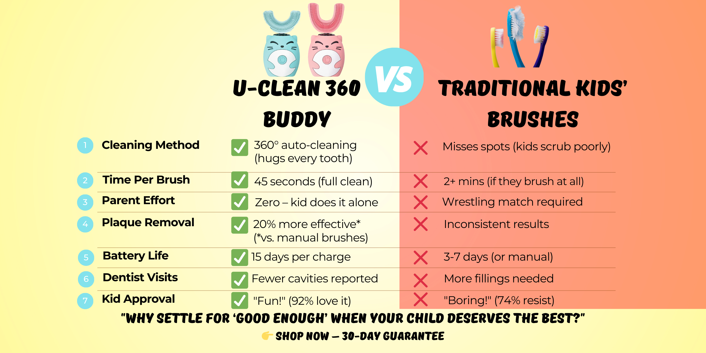 No scrubbing. No guessing. No tantrums. Just pop the U-Clean 360 Buddy in their mouth, and let sonic waves + 360° bristles attack plaque like a pit crew on teeth. Lab-tested to remove 20% more gunk than manual brushes—while your kid just sits there.This is parenting hacked.