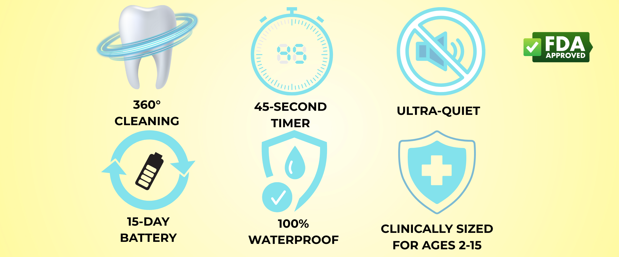 No more begging, bribing, or battles. The U-Clean 360 Buddy’s sonic waves + 360° bristles scrub every tooth automatically– like a robot hygienist for tiny mouths.*10,000+ parents report cavity-free checkups since switching.